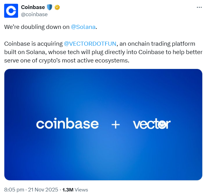 Bursa kripto asal Amerika Serikat, Coinbase, kembali memperluas jejak strategisnya di sektor keuangan terdesentralisasi dengan mengakuisisi Vector, sebuah platform perdagangan terdesentralisasi (DEX) yang dibangun di atas jaringan Solana. Nilai transaksi tidak diungkapkan, namun langkah ini menandai kelanjutan agresi ekspansi Coinbase sepanjang 2025.
