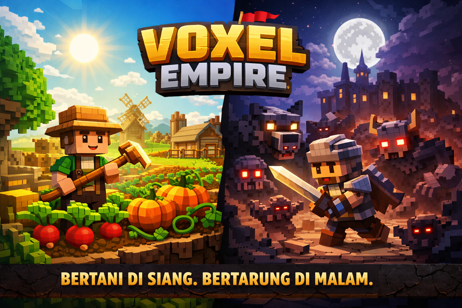 Voxel Empire hadir sebagai game strategi inovatif yang menggabungkan manajemen pertanian dan elemen pertarungan dalam satu ekosistem permainan yang dinamis. Mengusung slogan “Bertani. Bertarung. Bangun imperium-mu.”, game ini menawarkan pengalaman unik: membangun kejayaan di siang hari dan mempertahankannya di malam hari.